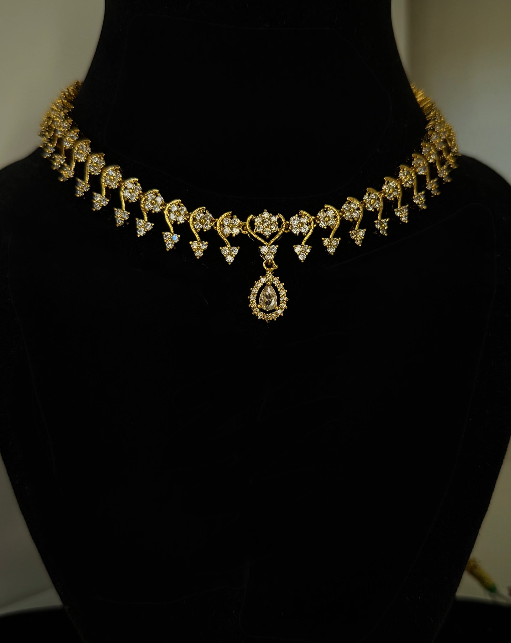 A refined gold-tone choker featuring alternating oval and teardrop motifs accented with white stones for a soft, shimmering finish. A single teardrop pendant at the centre adds a subtle focal detail.